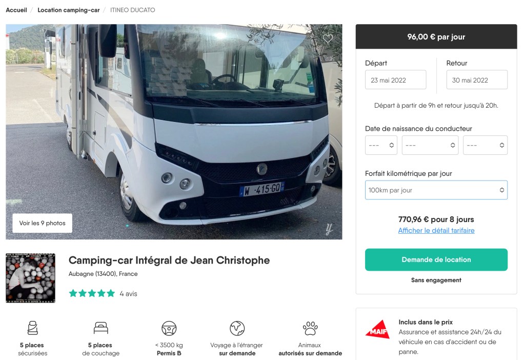 Prenons l’exemple d’un camping-car 5 places permis B pour 1 semaine au mois de Mai, saison idéale pour partir en vacances en camping-car (temps doux dans de nombreuses régions, de nombreux jours fériés et de très jolies régions fleuries). La location du camping-car coûte 96€ par jour.