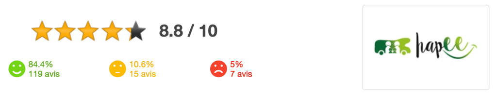 La plateforme Hapee est récente et ne dispose pas encore de notation chez TrustPilot. Elle obtient un 8,8/10 sur la plateforme Avis-Vérifiés. Cette plateforme est destinés à tous ceux que la réservation sur internet est un calvaire. Ils sont partenaires et présents dans les accessoiristes Loisireo et CLC. Cette plateforme est encore à ses balbutiements et reste encore loin derrière le trio de tête.