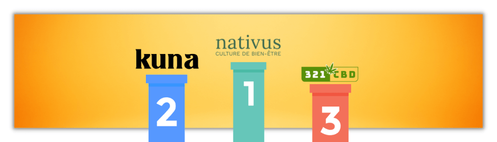 La plateforme Nativus arrive première grâce à son catalogue complet et de qualité. Le leader du classement est suivi de Kuna qui propose des produits de qualité en proposant une offre limité à des huiles et infusions. 321CBD arrive troisième, la plateforme ne proposant pas de produits biologiques et fabriqués en France, donnant l’avantage aux deux premières plateformes.