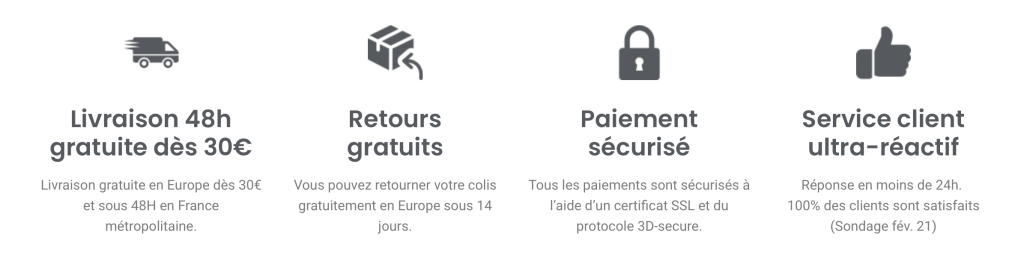 La plateforme propose une livraison et des retours gratuits, accessible dès 30€ d’achat. De plus, un conseiller est disponible rapidement pour toute demande spécifique concernant un produit ou une utilisation.