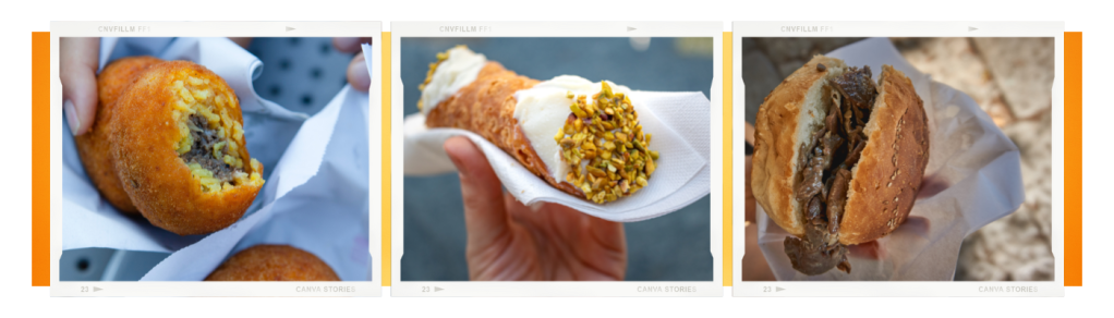 Palerme, comme beaucoup d’autres endroits en Italie possède des spécialités culinaires. La ville était auparavant très pauvre et possède des spécialités à base de produits que personne ne souhaité manger à l’époque. On y trouve notamment le célèbre sandwich à base de rate et de poumon, deux abats destinés auparavant à être jeté. Les brochettes d’intestins sont également courantes, notamment lors de votre passage sur le marché.